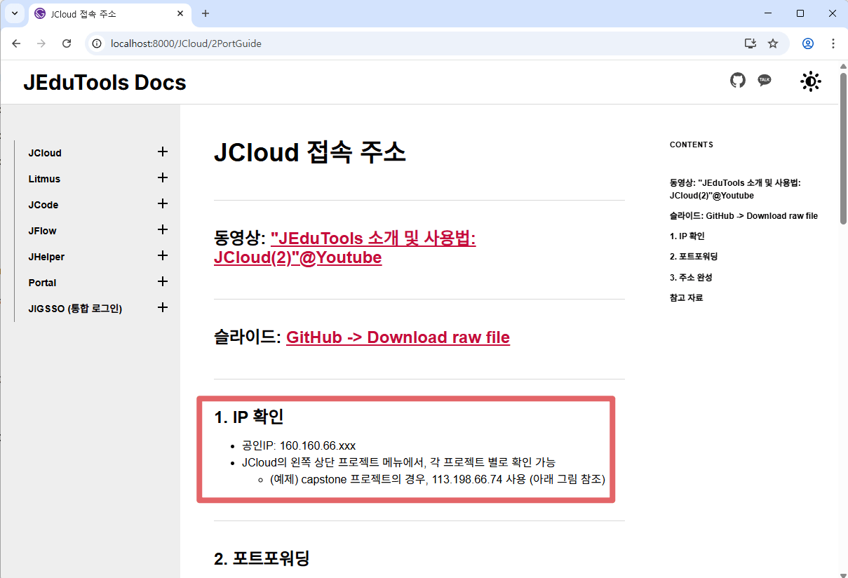 http://localhost:8000/JCloud/2PortGuide - 수정할 내용: 본문에 보이는